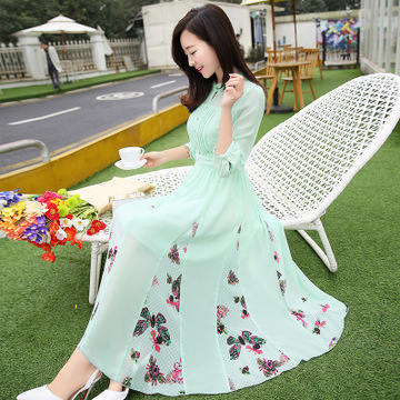 圓和方女裝2016春季新款沙灘裙韓版七分袖印花雪紡大擺裙波西米亞連衣裙女裝 /