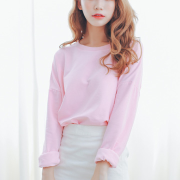 實(shí)拍#韓版秋季新款純色圓領(lǐng)短款長袖t恤女士大碼糖果色衛(wèi)衣女 /