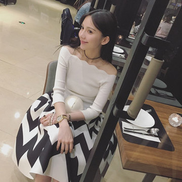2016夏季新款超氣質(zhì)的波浪領(lǐng)邊一字領(lǐng)針織小喇叭袖上衣 /