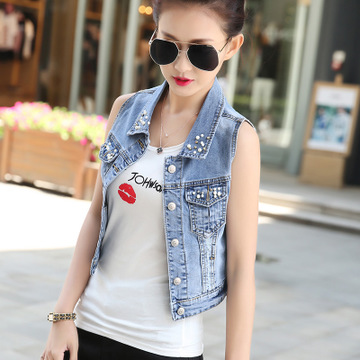 蔓美妮女裝春夏季新款無袖牛仔馬甲女韓版時尚磨破鉚釘馬夾背心 短 /