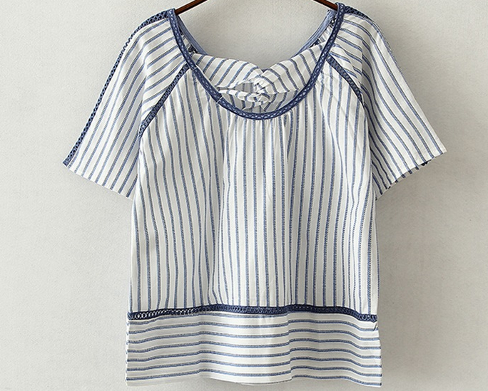 協(xié)雅女裝2016夏季新款女裝圓領短袖條紋拼接休閑百搭卡通刺繡系帶露背T恤 /