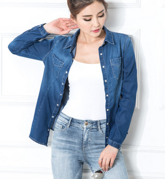 HIYOUNG牛仔襯衫女士長袖修身襯衣春韓版休閑百搭水洗牛仔衫上衣 /