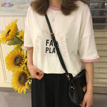 復(fù)古韓國學(xué)院風(fēng)簡單拼色百搭字母印花寬松圓領(lǐng)短袖T恤女裝A0423F /