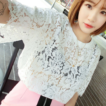 2016夏季新款韓版寬松蕾絲t恤潮圓領(lǐng)鏤空百搭時(shí)尚顯瘦純色短袖女 /