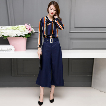 2016新款女裝春夏兩件套韓版條紋上衣闊腿褲休閑時(shí)尚套裝廠價(jià)直銷 /