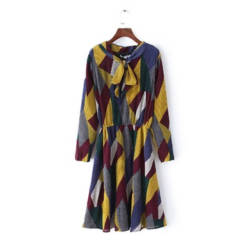2016春裝新款復(fù)古系帶蝴蝶結(jié)拼色長(zhǎng)袖連衣裙高腰A字裙短裙 /