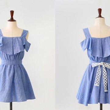 2016夏裝新款韓版荷葉邊吊帶連衣裙女藍(lán)色短裙A字裙夏裝 /