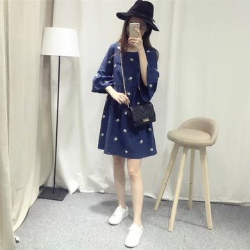 小清新2016春夏新款學(xué)院女裝文藝中長款五分袖小花刺繡寬松連衣裙 /