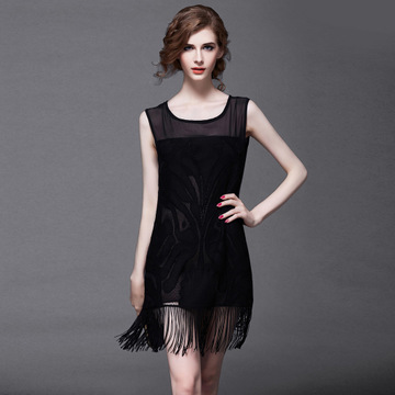 歐洲站2016夏裝新款蕾絲拼接流蘇氣質(zhì)修身不規(guī)則背心連衣裙短裙 /