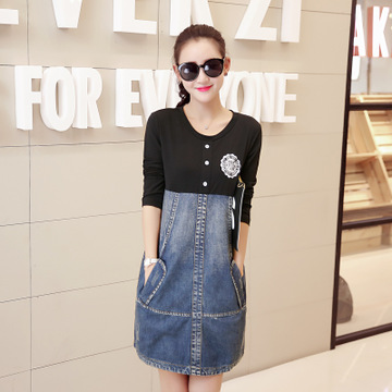 實拍 牛仔連衣裙女2016新款中長款針織牛仔拼接打底裙子潮 /