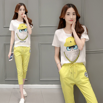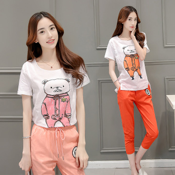 2016新款女裝夏裝顯瘦兩件套短袖卡通印花七分褲休閑時尚套裝女 /