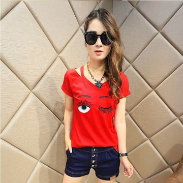2016夏裝新款韓版女裝潮款百搭露肩眼睛刺繡顯瘦短袖t恤女打底衫 /
