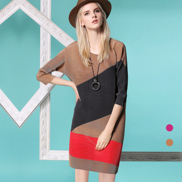 大牌夏裝新款 三宅一生連衣裙圓領中袖寬松大碼女裝撞色褶皺工藝 /