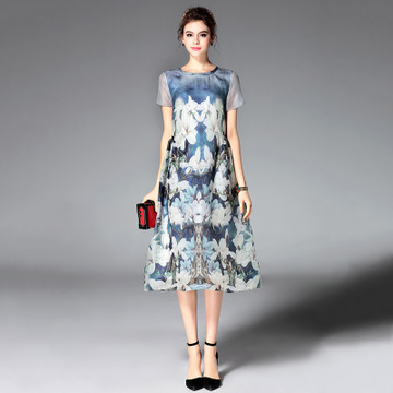 2016夏季新品高端重印花真絲緞短袖大碼連衣裙修身顯瘦連衣裙批發(fā) /