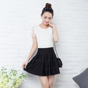 2016夏季新款黑色花邊百褶裙 A字修身蓬蓬裙 女 氣質(zhì)高腰半身裙 /