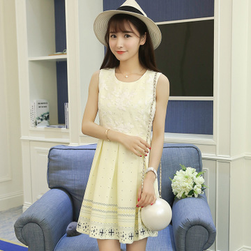 2016夏季新款時尚無袖蕾絲連衣裙夏韓版歐根紗顯瘦印花a字裙子女 /