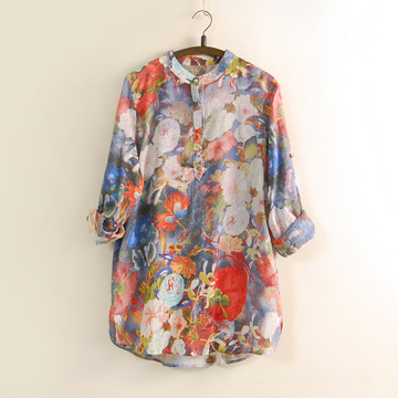韓版2016春季女裝復(fù)古印花立領(lǐng)套頭長袖襯衣中長款花襯衫 /