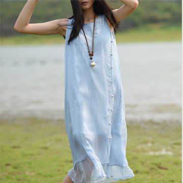 清新文藝2016春夏新品復(fù)古側(cè)盤扣仿真絲無袖連衣裙長裙女 /