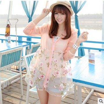 夏新款韓版女裝長袖防曬衣連帽歐根紗玫瑰印花空調(diào)衫大碼防曬服 /