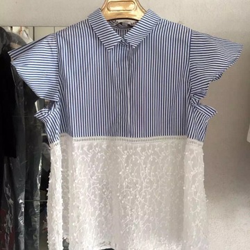 地素同款夏季新款歐美條紋拼接寬松翻領(lǐng)短袖襯衫女上衣3M2D314 /