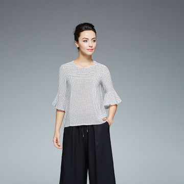 2016歐美高檔氣質(zhì)女裝圓領(lǐng)五分喇叭袖直筒波點桑蠶絲真絲T恤上衣 /