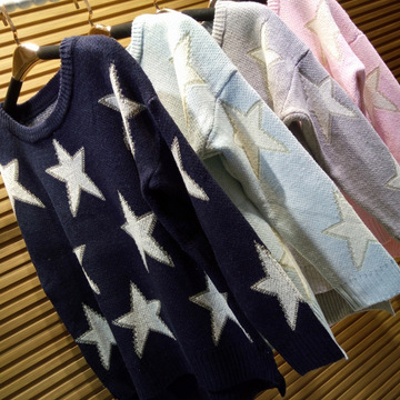毛衣女2015秋冬韓版新款五角星印花套頭圓領(lǐng)寬松上衣百長袖毛線 /