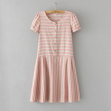 外貿(mào)原單 春夏文藝女裝新款日單森女系彩條紋棉麻短袖顯瘦連衣裙 /