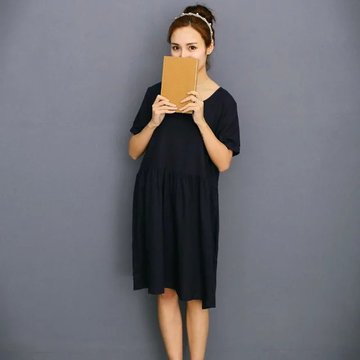 竹節(jié)亞麻連衣裙夏 中長款圓領(lǐng) 棉麻長裙收腰短袖袖大擺裙 /