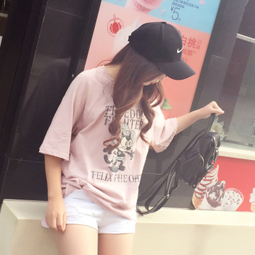 夏季韓版女裝休閑百搭竹節(jié)棉純棉中長(zhǎng)款卡通半袖短袖T恤上衣 /
