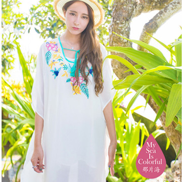 新款歐美繡花刺繡性感海邊沙灘度假遮陽防曬罩衫雪紡衫裙 /
