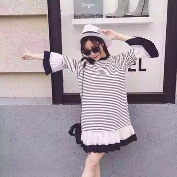 歐洲站2016夏季新款條紋拼接壓褶下擺寬松百搭喇叭袖休閑連衣裙女 /