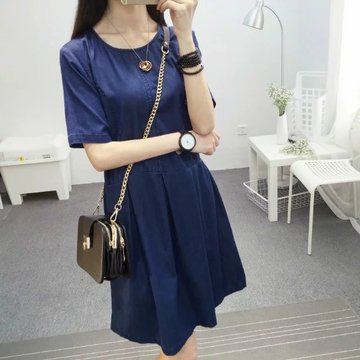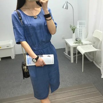 韓國代購2016夏季新款 松緊腰中袖天絲牛仔連衣裙 牛仔裙 X933 /