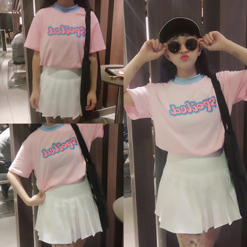 4353#ulzzang韓國INS潮人騷粉英文字母拼色微高領百搭寬松短袖T桖 /
