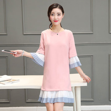 2016春夏韓國代購新款七分袖圓領(lǐng)百褶裙顯瘦連衣裙 /