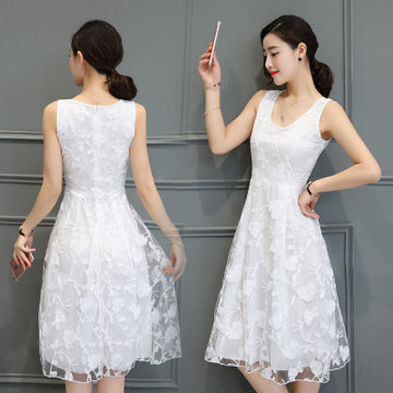清新甜美蕾絲白色連衣裙唯美修身氣質(zhì)沙灘裙夏長裙大擺A字裙 /
