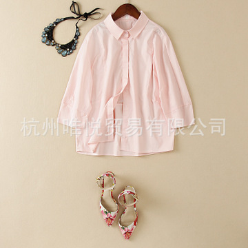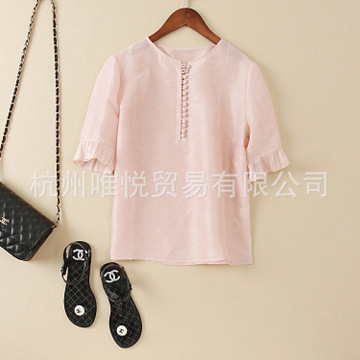 2016新款 歐美時尚減齡范 唯美荷葉袖 絲麻 圓領(lǐng)多扣襯衫上衣女 /
