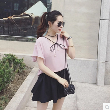 夏季新款韓版寬松V領(lǐng)純色百搭荷葉邊短袖套頭T恤 配細(xì)帶 A2524 /