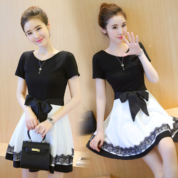 2016夏季新款名媛小香風修身連衣裙蝴蝶結系帶蕾絲拼接高腰A字裙 /