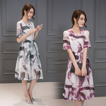 2016春夏爆款女潮名媛高腰修身圓領短袖印花歐根紗中長款連衣裙 /