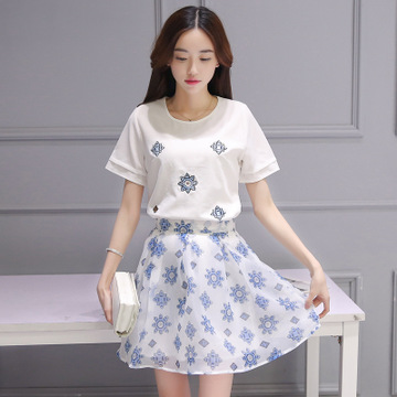 【實(shí)拍】2016夏裝新款棉麻刺繡上衣兩件套歐根紗套裝裙短裙 /