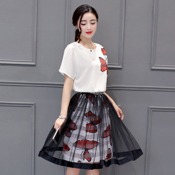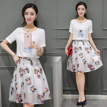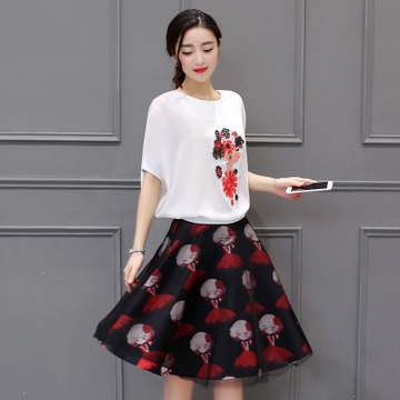 實(shí)拍套裝連衣裙夏季歐洲站短袖t恤雪紡蓬蓬裙印花半身短裙子 /