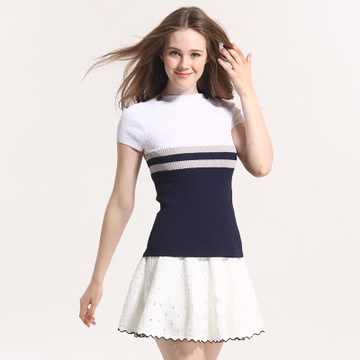 2016春夏新款 一字領(lǐng)短袖條紋針織衫修身顯瘦上衣女 /
