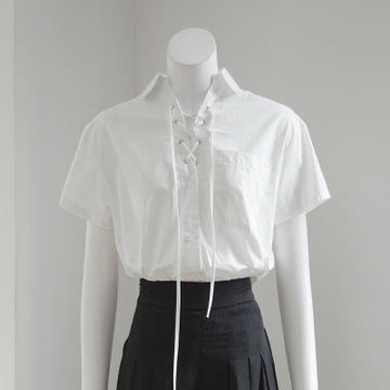 特價出口英國單夏季新款寬松直筒系帶襯衫短袖立領(lǐng)純棉上衣 /