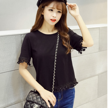 2016春夏季新款修身顯瘦純棉短袖t恤 勾花純色圓領(lǐng)學(xué)生t恤女批發(fā) /