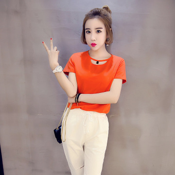綠兒2016夏裝新款 韓版鏤空?qǐng)A領(lǐng)短袖套頭修身顯瘦百搭t恤女潮k251 /