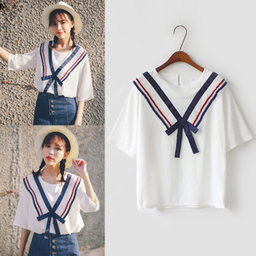 學(xué)院風(fēng) 夏新百搭網(wǎng)紗拼接短袖海軍領(lǐng)寬松T恤 /