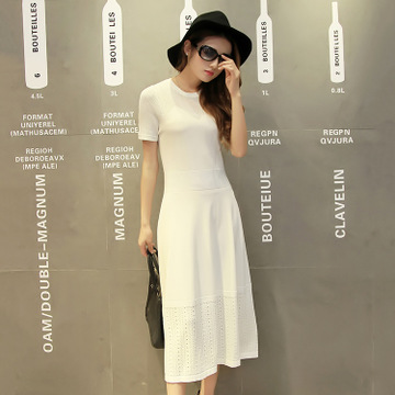2016連衣長(zhǎng)裙夏季韓版鏤空針織連衣裙修身百搭圓領(lǐng)短袖連衣裙夏季 /