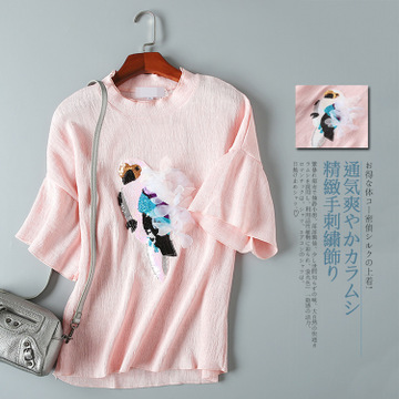 PDE2-高品質(zhì)亮片重工刺繡小鳥(niǎo)夏季女新款木耳領(lǐng)壓折短袖上衣女T恤 /