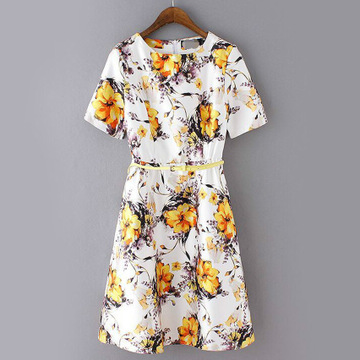 2016夏季新款歐美風(fēng) 短袖高腰修身A擺印花連衣裙含腰帶批發(fā) /