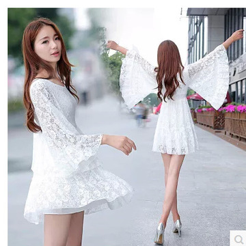 • 2016夏裝新款韓系高腰復(fù)古修身長袖打底喇叭袖蕾絲連衣裙 /